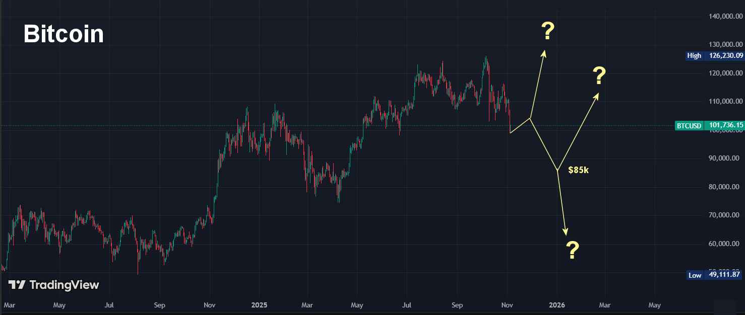 Annie from Trade, Travel Chill is suggesting that BTC could see a pullback to $85k, but in the Cryptoverse, that is still a minor setback. From here, we see three possible scenarios.