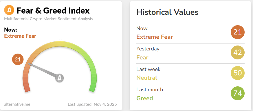 True cycle tops rarely form in fear. They form in euphoria, typically with the Fear & Greed Index above 90, signaling extreme greed. In October 2025, Bitcoin barely touched the low-70s. Today, the CoinMarketCap index sits around 21—deep in fear territory.