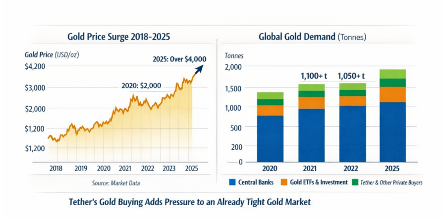 Tether’s gold buying isn’t just symbolic; it might actually be affecting the price of gold. The world’s gold mines produce roughly 3,000–3,500 metric tonnes per year.  In 2025, analysts estimated that Tether’s buying accounted for roughly 2% of global gold demand in a single quarter. At the same time, gold prices climbed past $4,000 per ounce, hitting new records.
