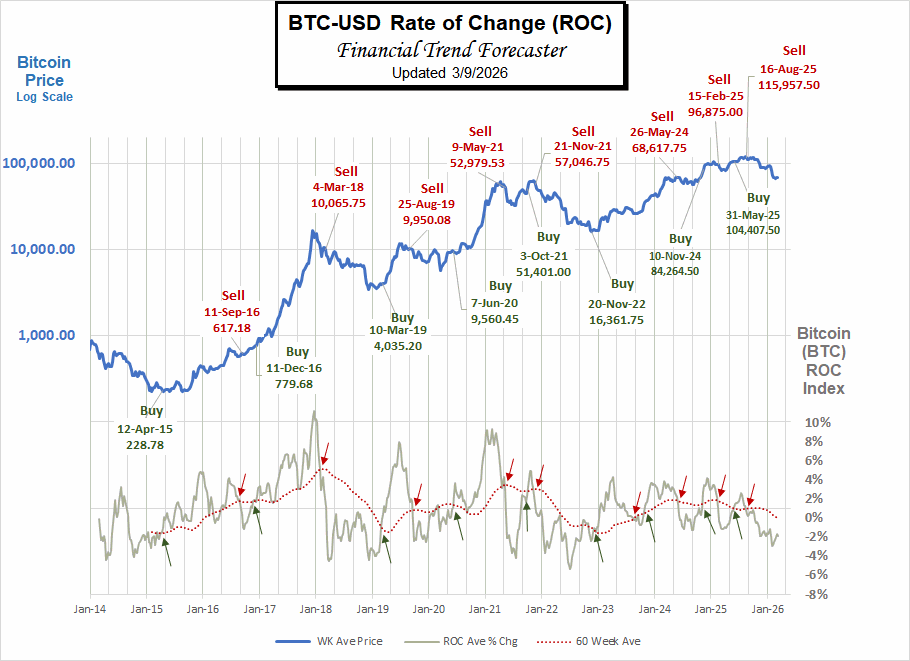 On August 16, 2025, our BTC ROC generated a Sell signal (with BTC at $115,957) as BTC ROC crossed below its dotted average line. BTC peaked a few weeks later at $126,110. For the short-term trader, that was an excellent time to reduce your BTC holdings.