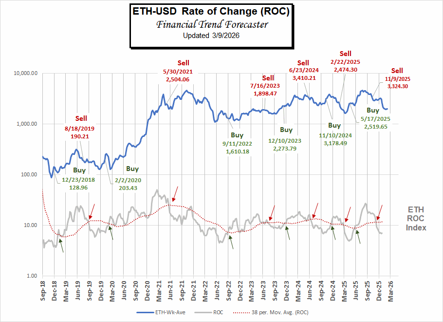 After spending months in the doldrums (and falling significantly), ETH rocketed 40.89% higher in the first week of May 2025. And a couple of weeks later, our ROC chart generated a Buy signal for ETH. Then, ETH moved sideways throughout June, providing an excellent buying opportunity. July and August were mostly up, peaking just under $5,000 before taking a breather. Then, on November 9th, 2025, ETH issued its sell signal, which remains in place.