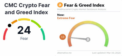 The CMC index is broader, measuring all of Crypto, while the Alt.me index focuses primarily on Bitcoin. Typically, they are very close, but on March 10th they differed quite a bit with the CMC at 24 and the Alt.me at 13.