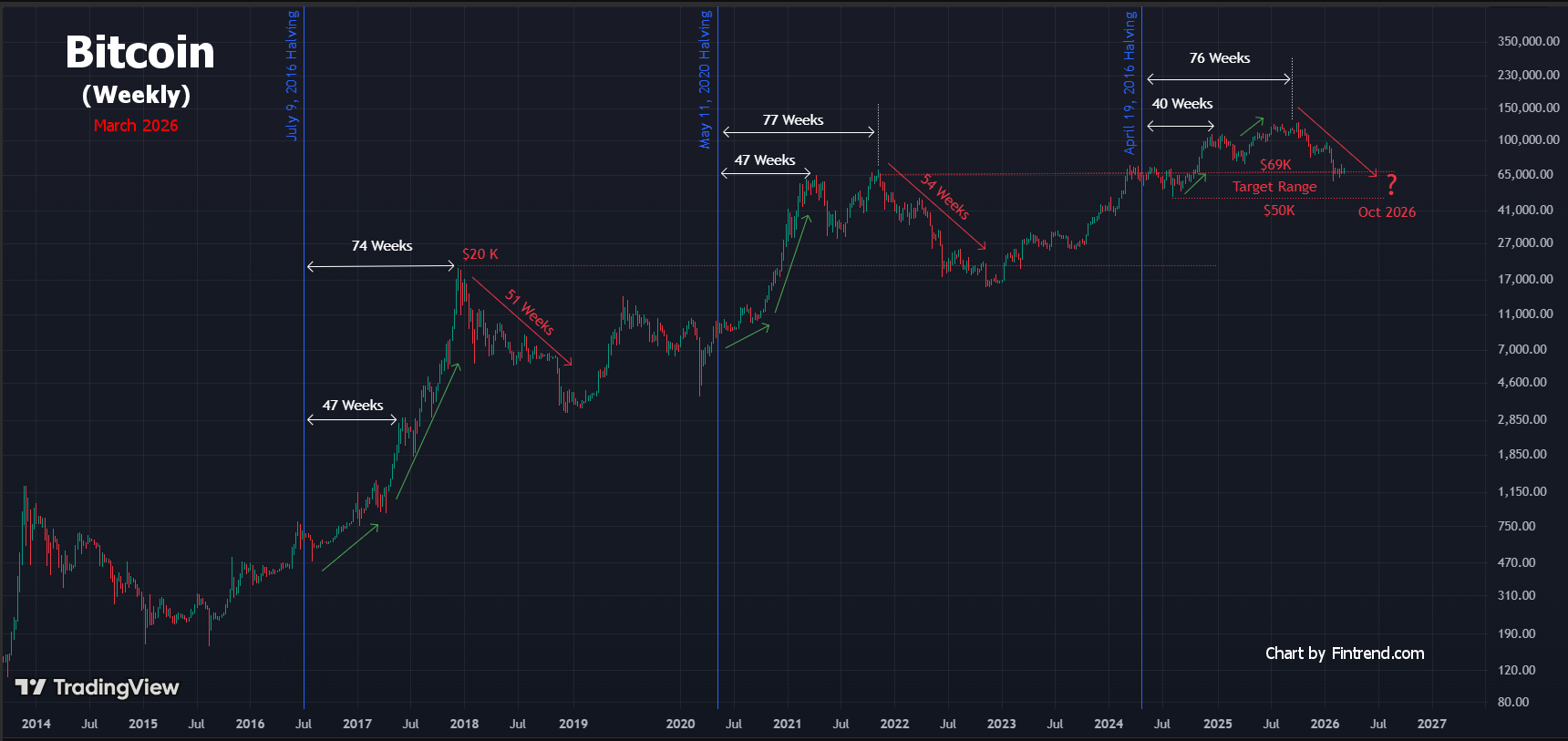 The next thing we see on the chart is that the previous two corrections lasted roughly 51-54 weeks, so we would expect the current bottom to end in October 2026. However, since the FED has now shifted to a looser monetary policy, the bottom could arrive sooner. And finally, we can see where bottoms usually occur. The 2023 bottom was slightly below the 2018 top and above the 2019 secondary peak. If that holds for the 2026 downturn, we should expect the price to bottom somewhere slightly below $69k (perhaps in the $50-65k range) sometime around October 2026. But it is possible that it will get to that level sooner, and then trade in a flat range or have a truncated down period. But, In our article, Did the Crypto Bear Market Begin in October 2025, we noted that legendary investor W.D. Gann was adamant that, “Markets are a function of Time and Price”. He was convinced that markets have a rhythm that had to play out before the uptrend could continue. The W.D. Gann Master Stock Market Course